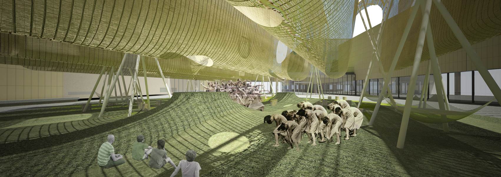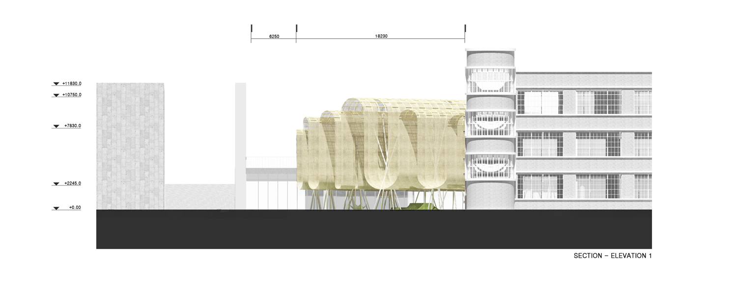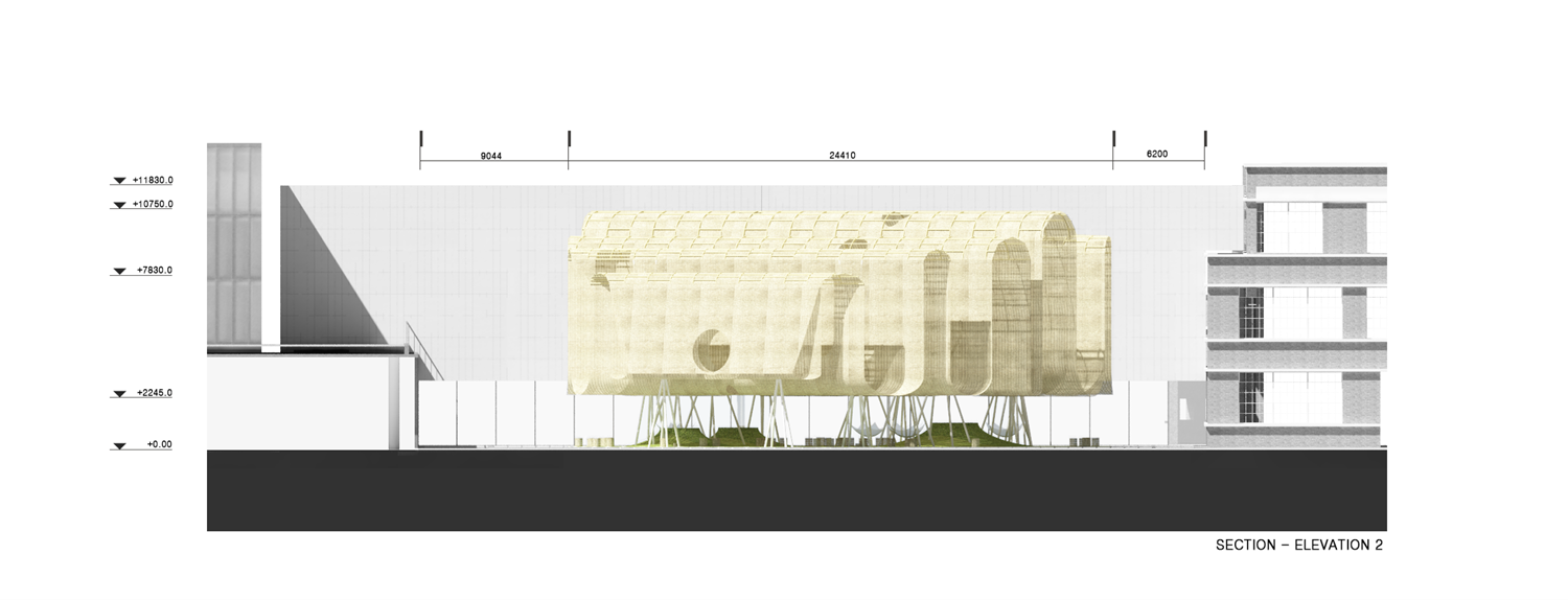 This exhibition brings those foundations back into view through a carefully assembled set of drawings, including plans, sketches, diagrams, and material studies. Rather than reconstructing the installation in its physical form, the presentation re-examines the project’s conceptual underpinnings: the logic that guided its geometry, the spatial flows it proposed, and the environmental considerations that informed its design.